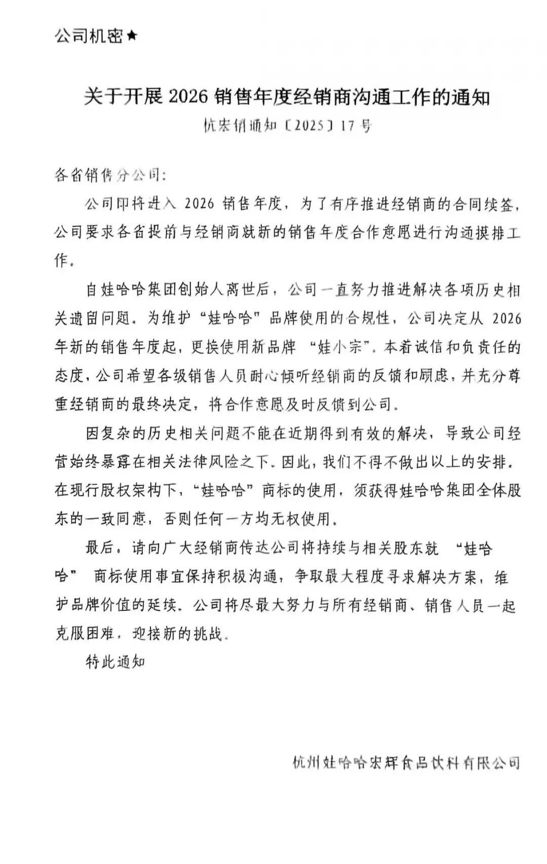 此前,一份《关于开展2026销售年度经销商沟通工作的通知》显示,自娃哈哈集团创始人离世后,公司一直努力推进解决各项历史相关遗留问题,为维护“娃哈哈”品牌使用的合规性,公司决定从2026年新的销售年度起,更换使用新品牌“娃小宗”。